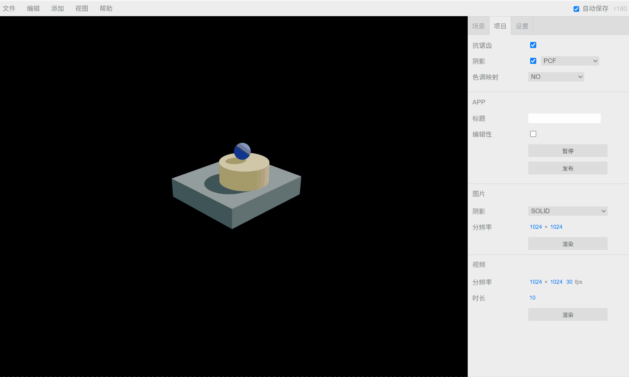 }设置完成后点击代码部分右上角的x关闭代码,面板切换到项目,在APP一栏找到启动按钮点击,可以看到模型旋转效果: